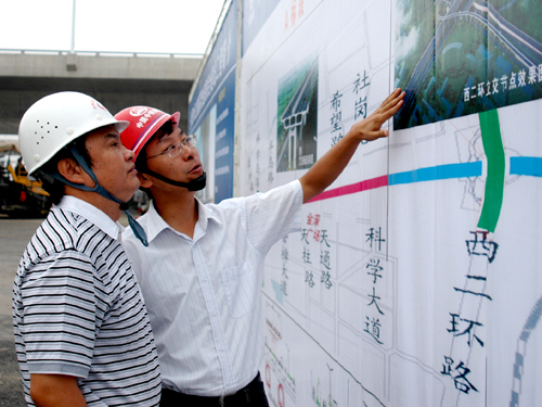 潘逸阳一行首先来到了正处于大干期间的跨西二环高架工程,实地查看了中铁四局现场文明施工、工程质量控制和安全防护保障情况,并对四公司统筹兼顾进度、安全、质量的做法给予了高度评价。观摩过程中潘逸阳还详细听取了项目负责人对工程施工中甲供料的采购供应方式和施工管理模式的介绍。观摩结束时,潘逸阳表示,希望今后两市政府和企业之间能够加强交流,优势互补。