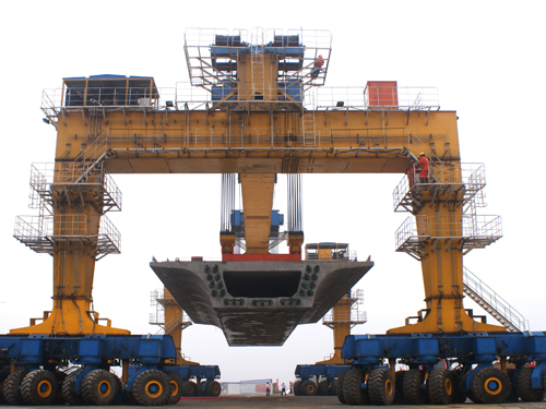 第一片箱梁长32米,重764吨。此次提吊作业,制梁场领导高度重视,场长和总工轮班盯守在现场,精心组织,保证人员和机械的到位,同时要求维修人员二十四小时紧盯现场,对运行中的每一个环节进行监控,保证机械的正常运转;对设计图纸、吊点位置进行了多次核对,对提梁机进行了反复的预载试验;为了确保提吊过程中严格按照加载、提移、存梁的各道程序要求进行作业,提吊前,场部对操作人员进行了专门的技术培训,并组织相关人员进行反复演练,保证作业过程中能够统一调度、通力协作。在安全保障上,该制梁场专门制订了应急预案,并进行了反复演练,同时要求维修人员对当天的运行情况进行要有详细的记录,保证交接人员及时了解机械的运转情况;每天必须对机械进行一次检修,确保机械在提吊期间不出现意外。