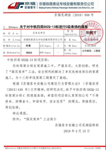 4月15日,机管中心商合杭铁路架梁分部获京福客专安徽公司芜湖指挥部C级通报表扬,业主对分部“踩双架单”工况给予了高度评价和充分肯定。