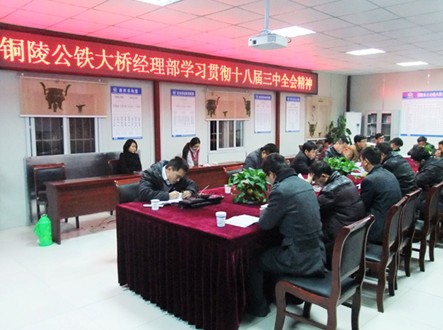 11月30日晚,铜陵公铁大桥项目部在会议室学习贯彻十八大三中全会精神,专题学习了《中共中央关于全面深化改革若干重大问题的决定》等文件内容。